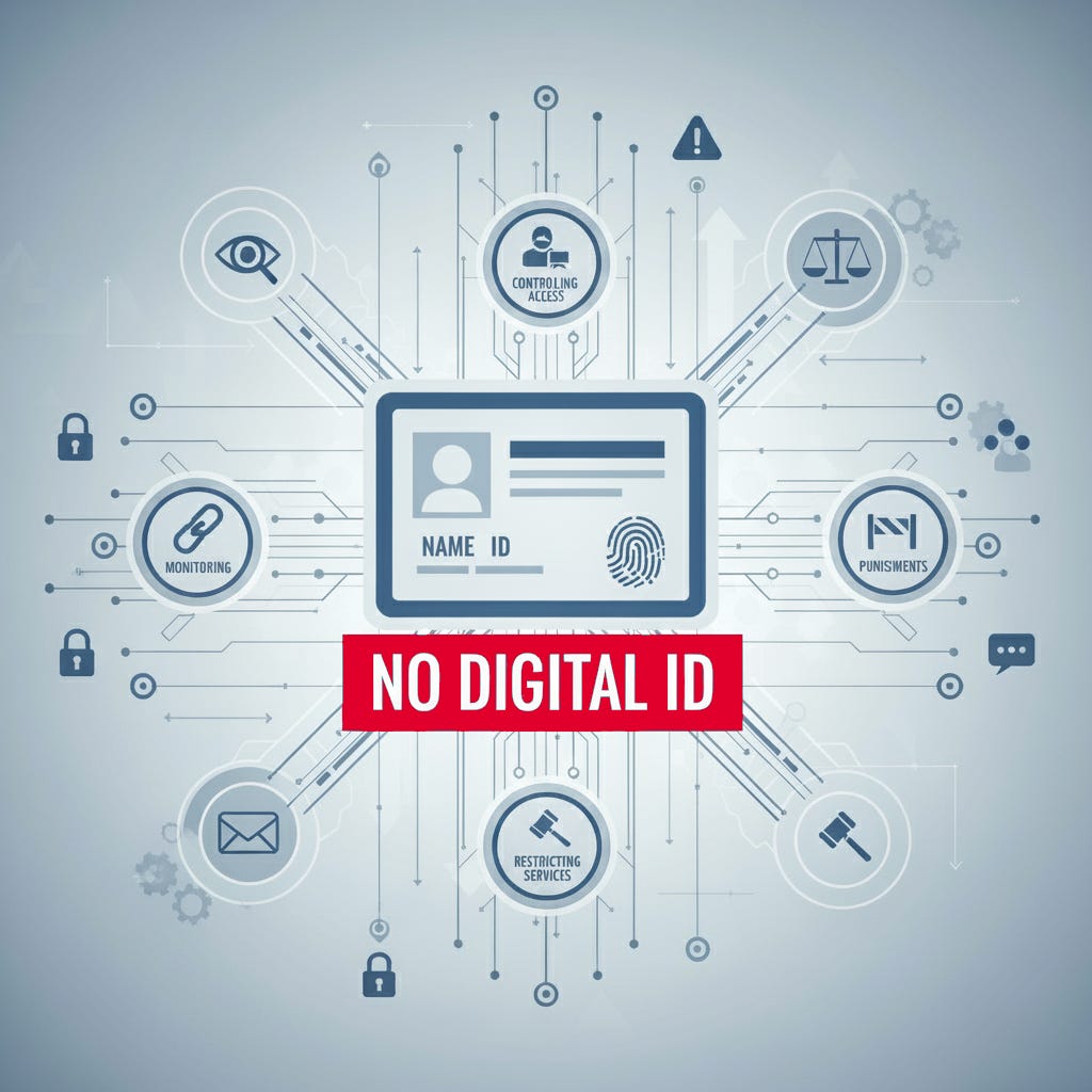 Our believe is that a Digital ID is part of a larger state sponsored surveillance, control and enforcement system.