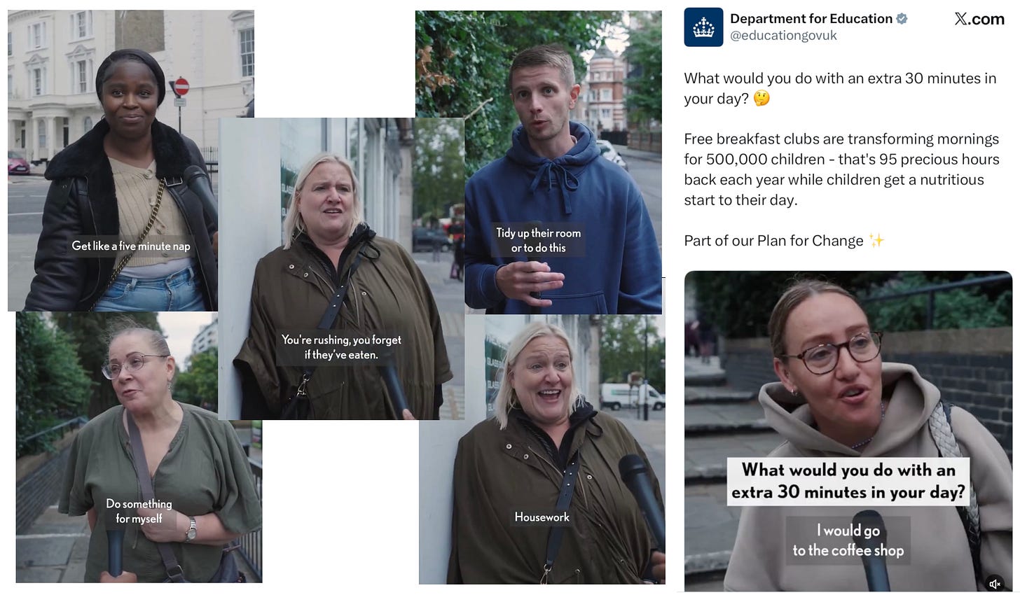 Today I see this unbelievable promotional video above from the Department for Education splashed all over social media, again created using tax payer money to explain why parents should be happy about these breakfast clubs. According to the video it’s because it can give them more time to ‘have coffee with other mums’ or ‘have a nap’, even stopping them from ‘forgetting if they have eaten’.
